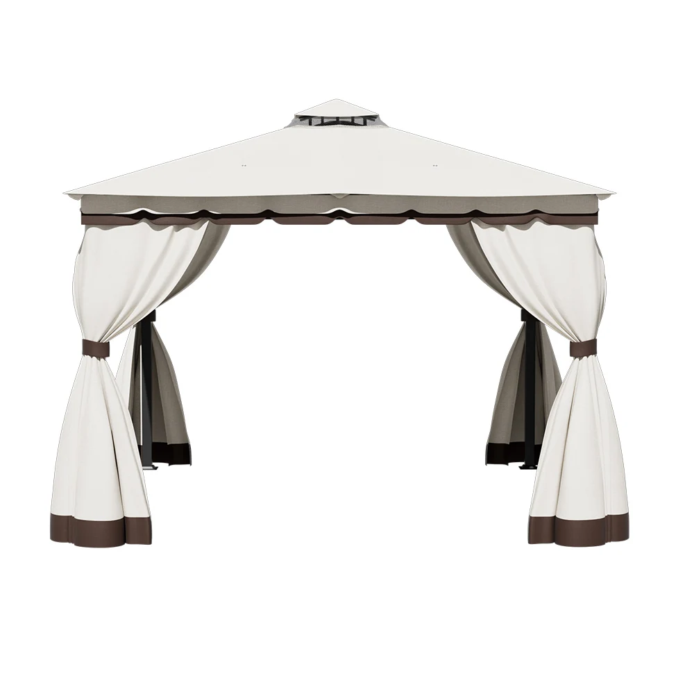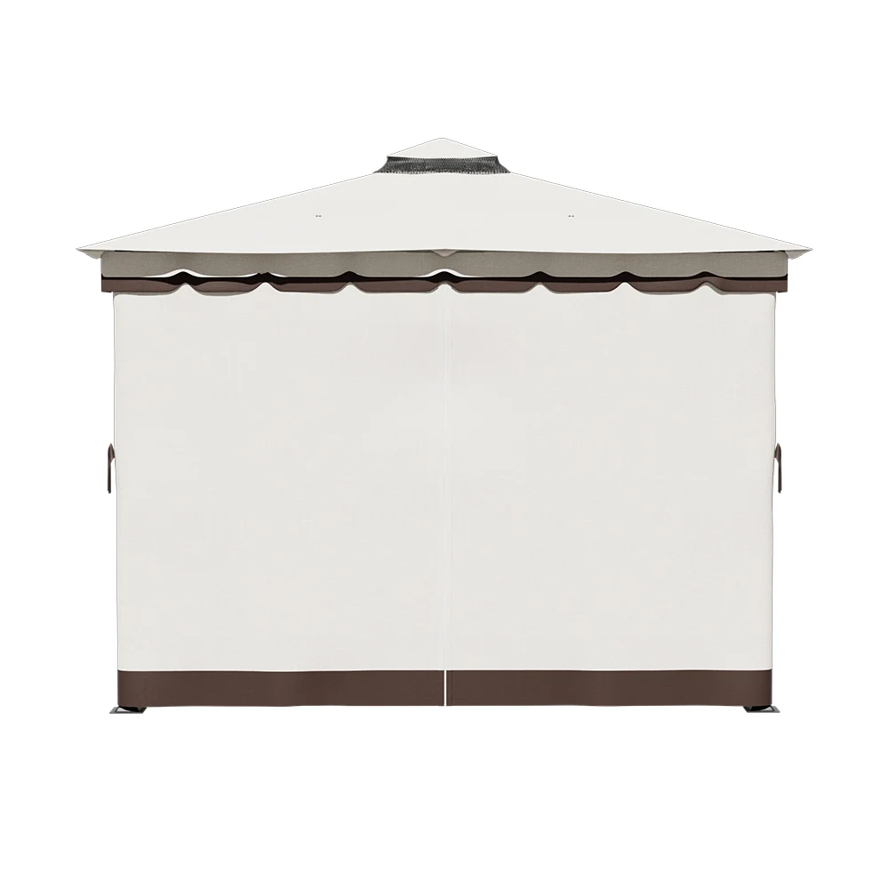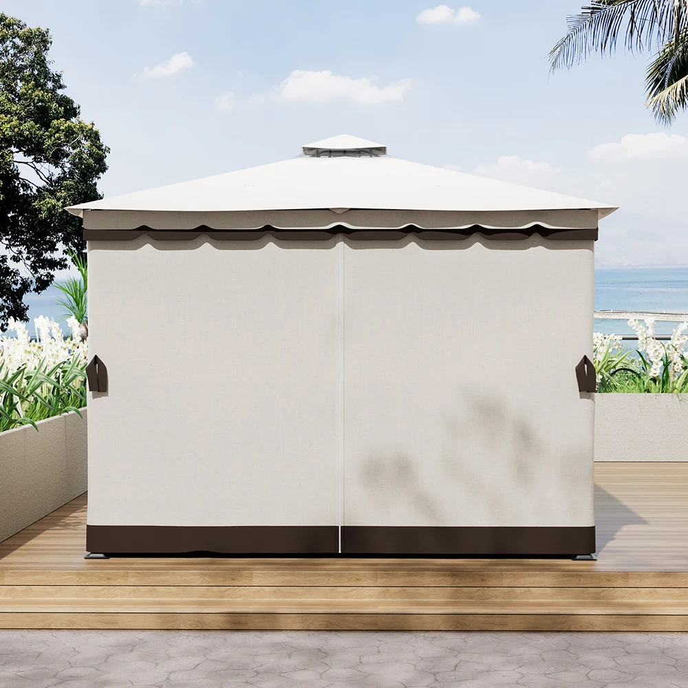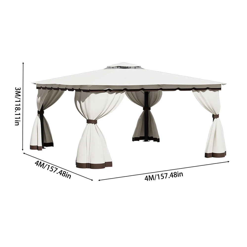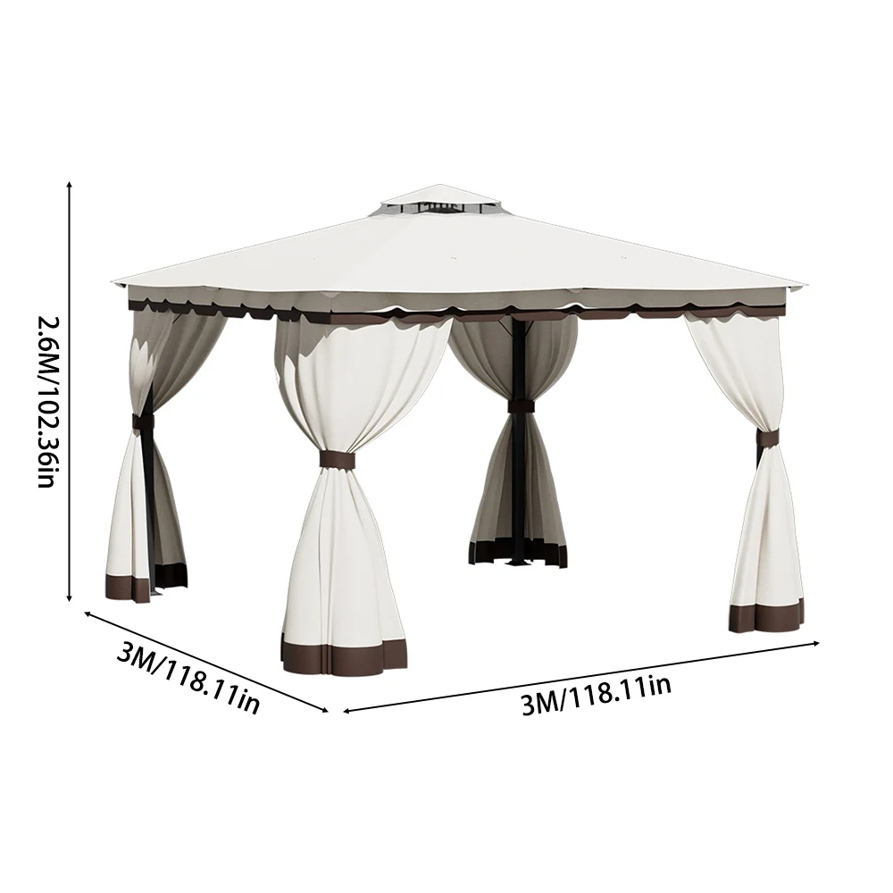 Infuse a year-round retreat for relaxation into your garden with this patio gazebo. Designed to offer both functionality and visual appeal, it features a ventilated polyester canopy with PU coating for reliable protection against sun and light rain. Its hipped roof design efficiently channels rainwater away, eliminating pooling while ensuring durability in all seasons. Clever tiered architecture enhances ventilation, maintaining a refreshingly cool atmosphere even when curtains are fully drawn. Spacious and inviting, the open layout comfortably hosts gatherings while promoting excellent air circulation. Adaptable side curtains—adjustable manually for precise shade or breeze control—create instant privacy and sun protection. Every detail merges sophistication with resilience, transforming your garden into a sanctuary of style and comfort.