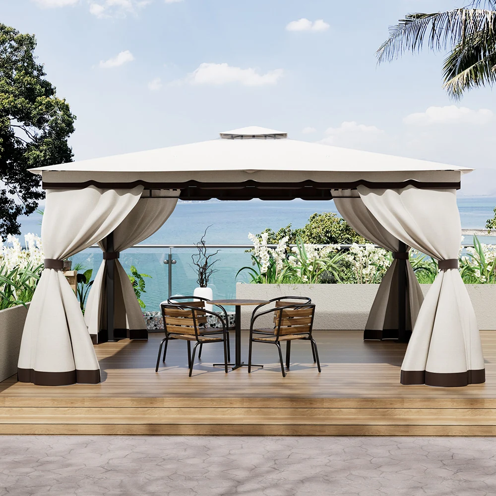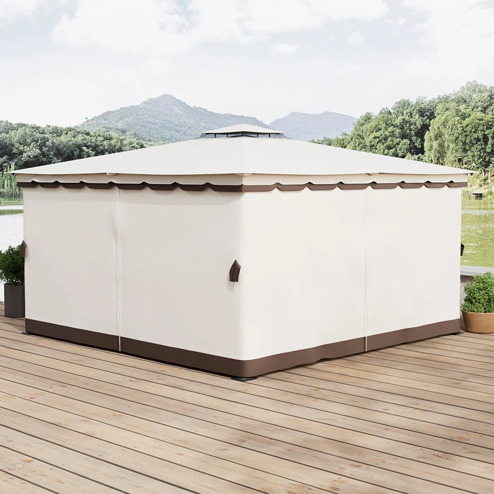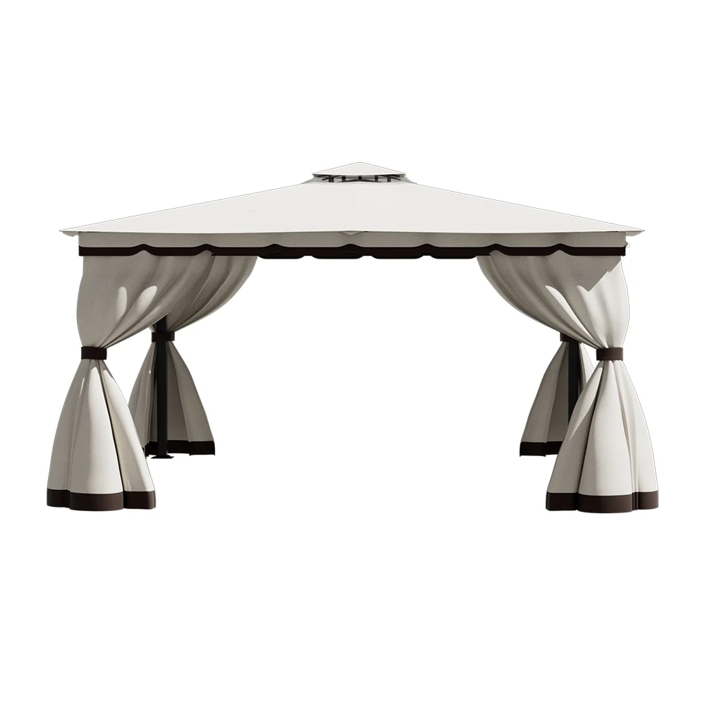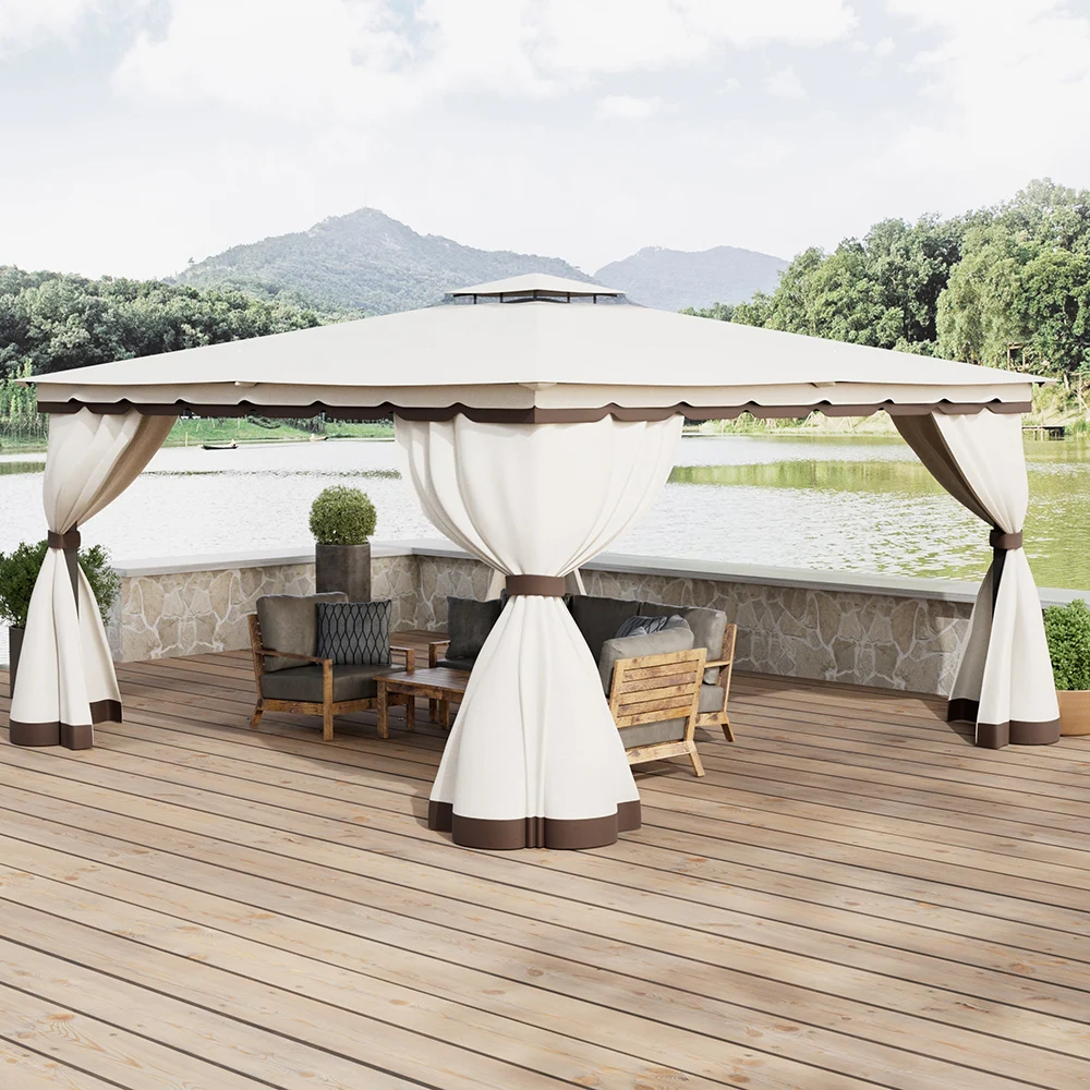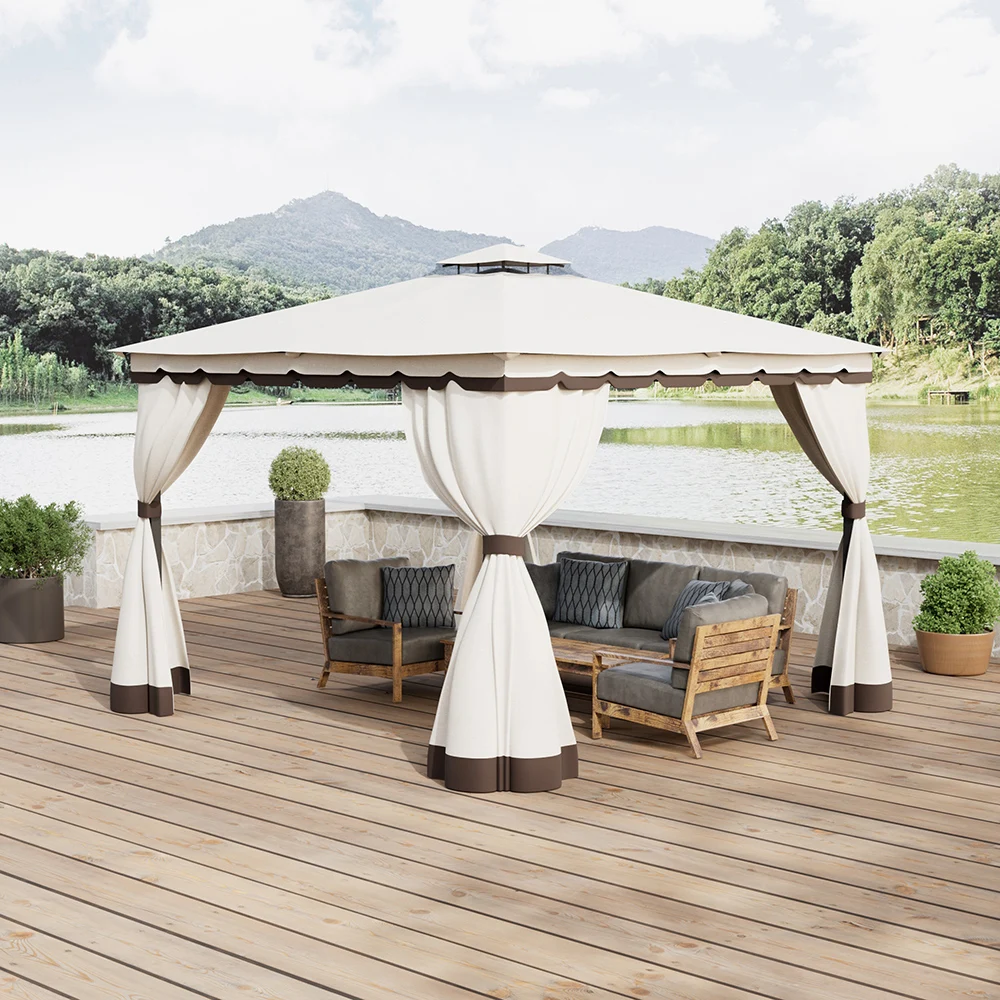 Infuse a year-round retreat for relaxation into your garden with this patio gazebo. Designed to offer both functionality and visual appeal, it features a ventilated polyester canopy with PU coating for reliable protection against sun and light rain. Its hipped roof design efficiently channels rainwater away, eliminating pooling while ensuring durability in all seasons. Clever tiered architecture enhances ventilation, maintaining a refreshingly cool atmosphere even when curtains are fully drawn. Spacious and inviting, the open layout comfortably hosts gatherings while promoting excellent air circulation. Adaptable side curtains—adjustable manually for precise shade or breeze control—create instant privacy and sun protection. Every detail merges sophistication with resilience, transforming your garden into a sanctuary of style and comfort.