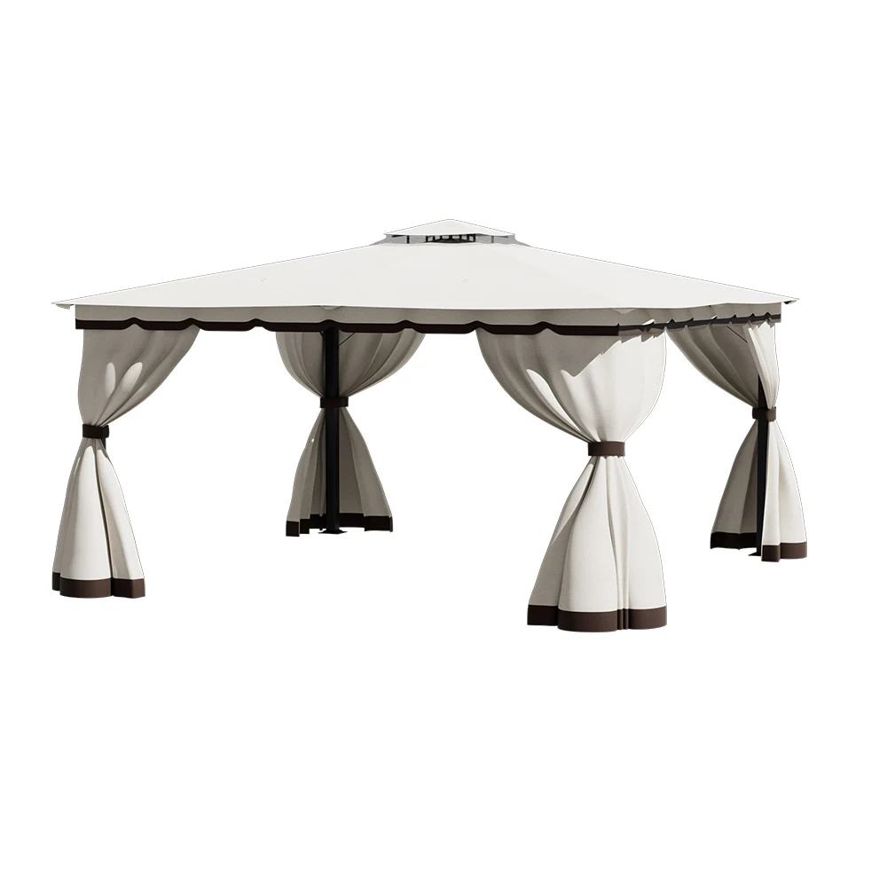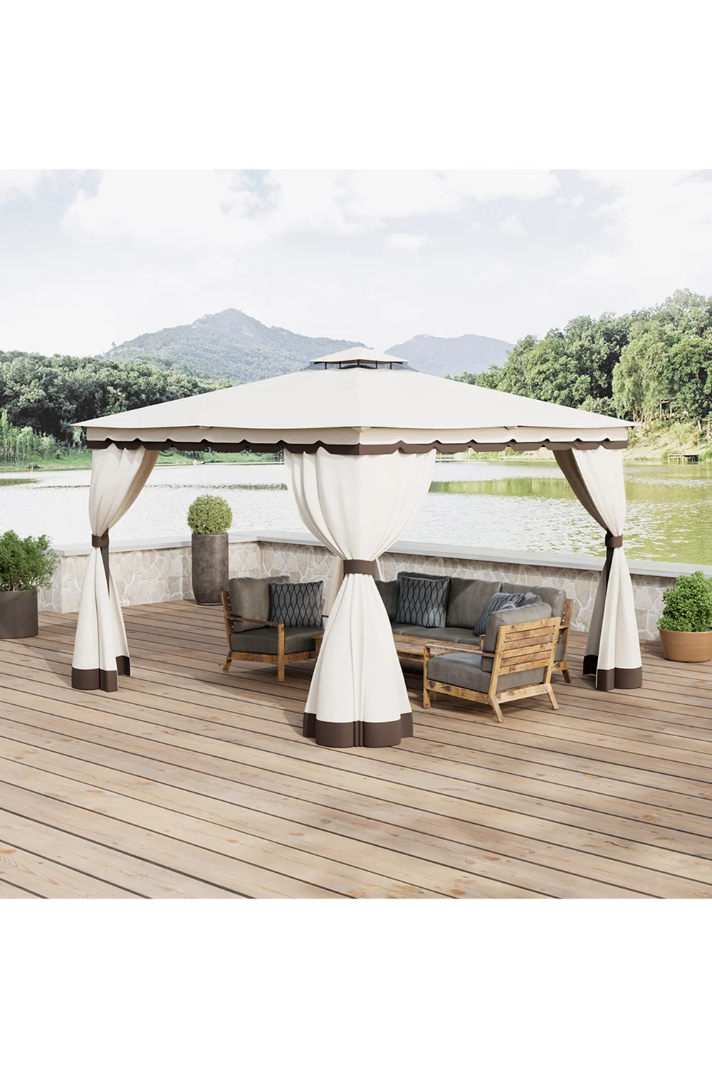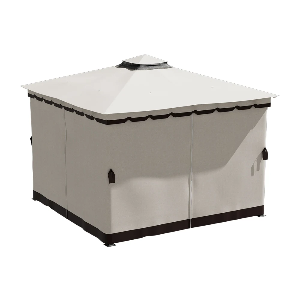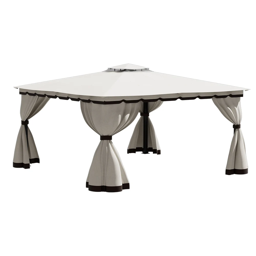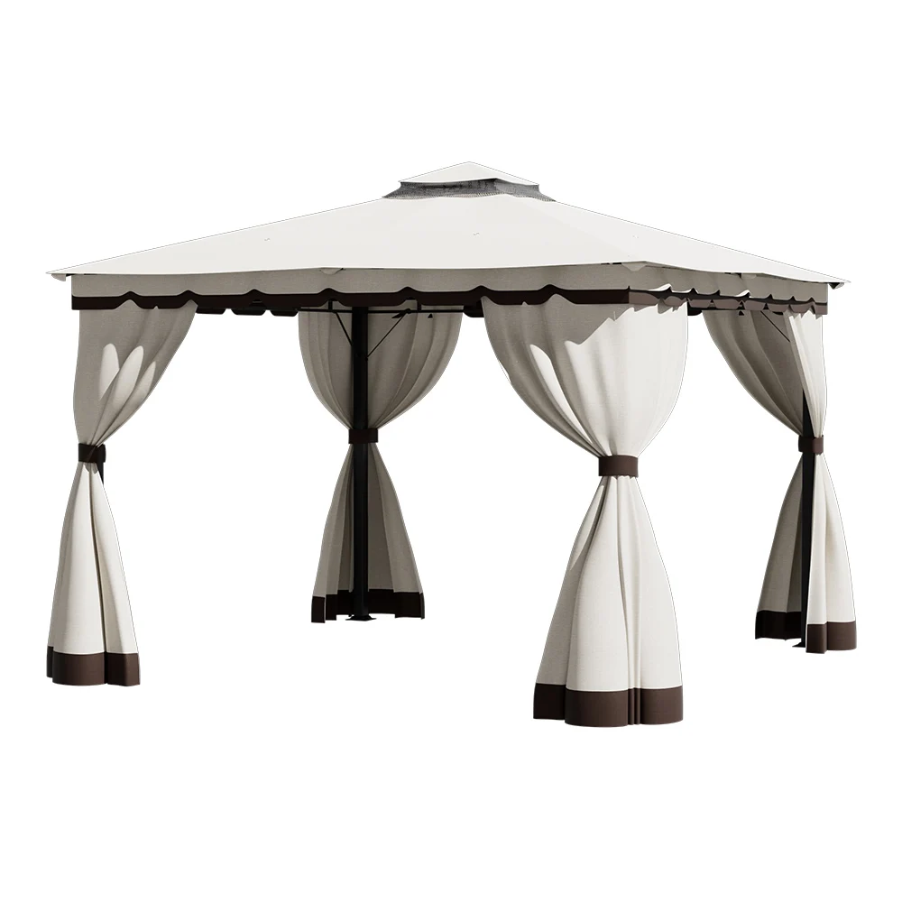 Infuse a year-round retreat for relaxation into your garden with this patio gazebo. Designed to offer both functionality and visual appeal, it features a ventilated polyester canopy with PU coating for reliable protection against sun and light rain. Its hipped roof design efficiently channels rainwater away, eliminating pooling while ensuring durability in all seasons. Clever tiered architecture enhances ventilation, maintaining a refreshingly cool atmosphere even when curtains are fully drawn. Spacious and inviting, the open layout comfortably hosts gatherings while promoting excellent air circulation. Adaptable side curtains—adjustable manually for precise shade or breeze control—create instant privacy and sun protection. Every detail merges sophistication with resilience, transforming your garden into a sanctuary of style and comfort.